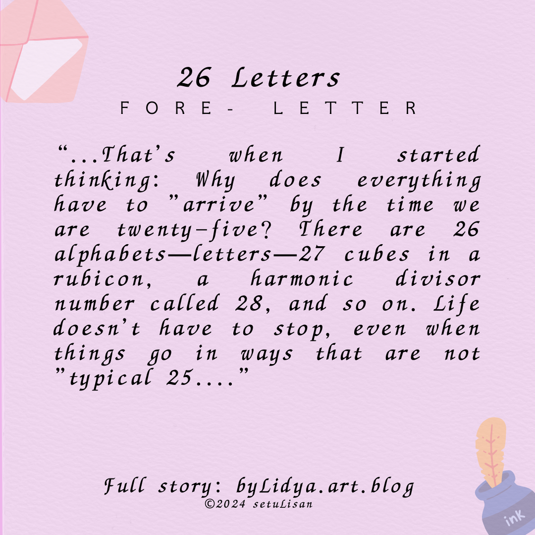 That’s when I started thinking: Why does everything have to “arrive” by the time we are twenty-five? There are 26 alphabets—letters—27 cubes in a rubicon, a harmonic divisor number called 28, and so on. Life doesn’t have to stop, even when things go in ways that are not “typical 25.”